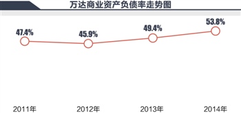 根据万达商业的招股书以及年报数据显示,2011年至2014年年末,其资产负债率分别为47.4%、45.9%、49.4%、53.8%。截至去年年底,公司净负债率为56.68%,较2013年底的52.98%上升了3.7个百分点。同时,去年公司的总负债同比增加35%至1810亿元,利息净支出高达71.32亿元。