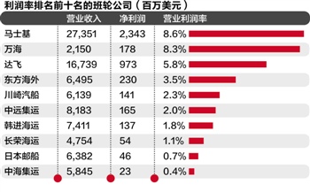 但它们比世界巨头马士基逊色太多,马士基在2014年的营业利润方面大幅甩开了中远集运、中海集运,在全行业2014年的营业利润率仅为2.9%的情况下,马士基航运以8.8%以上的税前利润率傲视群雄,大幅跑赢市场平均水平。