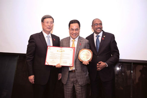 联合国副秘书长兼艾滋病规划署执行主任西迪贝授予汉能“积极参与艾滋病防治优秀企业”荣誉证书