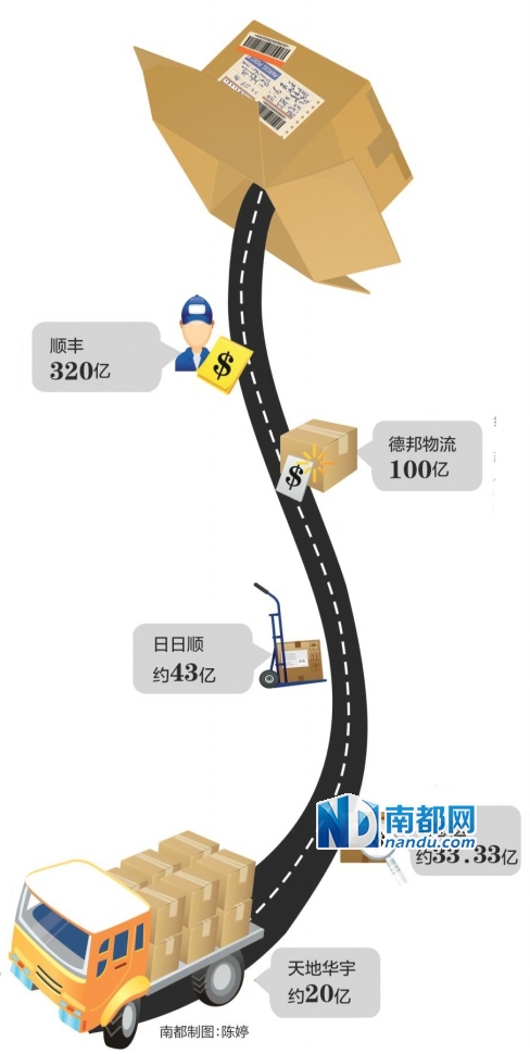 排第二的为德邦。日日顺排第三位,一年多前,阿里出资5.41亿港币直接认购日日顺物流9 .9%的股权,算出估值约43亿。随后是宅急送,今年10月,宅急送出让30%的股权,引入复星集团,招商证券[-2.29% 资金 研报]、海通证券[-1.87% 资金 研报]、弘泰资本、中新建招商股权投资基金的战略融资10亿元,推算出估值约33 .33亿。最后为天地华宇,该公司被中信7.5亿收购。不过8年前,T N T收购天地华宇物流时花了逾11亿元,可见卖出价明显偏低。因此市场估算其市值已升到20亿。