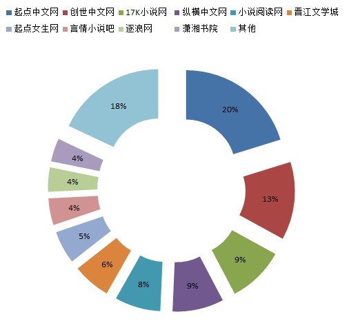 根据易观《2014年第3季度中国网络文学活跃用户市场竞争格局》报告显示,前10文学网站中,盛大文学旗下起点中文网等几家网站在PC端的活跃用户约占50%市场份额,创世中文网、17K小说网和纵横中文网仅占30%市场份额。