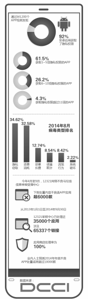 DCCI(互联网数据中心)和360近日共同发布的《2014年上半年Android手机隐私安全报告》显示,安卓商店下载排名靠前的1200个APP中,92%的安卓应用获取了隐私权限,获取1到5项隐私权限的APP占61.5%,获取6到10项隐私权限的占26.2%。