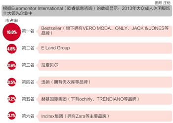 早早便进入中国的马莎百货却没能抓紧快时尚迅速崛起的脉搏,眼看着三大竞争对手销售额屡刷新高。根据记者得到的Euromonitor International(欧睿信息咨询)数据显示:2013年大众成人休闲服饰十大领先企业中,Bestseller(旗下拥有VERO MODA、ONLY、JACK & JONES等品牌)排名第一,三大快时尚巨头迅销(拥有优衣库等品牌)、Inditex集团(拥有ZARA等主要品牌)以及H&M则分别以3.5%、3.1%和2.3%的市占率排名靠前。