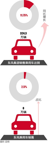 东风乘用车的业绩在东风汽车集团内部也并不显眼。去年,东风集团销售乘用车达到了324.3万辆,同比增长11.75%。东风乘用车销售了8万辆,占比只有2.5%。