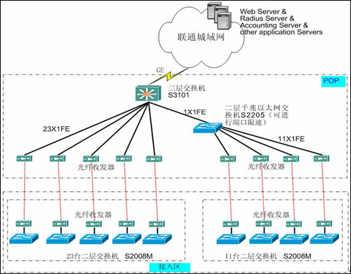 设置一个POP点该节点作为本工程的接入层的汇聚节点。小区用户的认证由POP点所在网络的上一层设备提供。