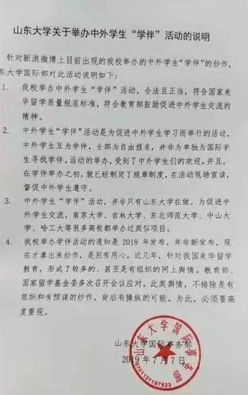 数日后,山东大学官方再次发布声明,承认在“学伴”项目实施过程中存在审核把关不严格的问题,在报名表格中出现了不当选项,对此引发的不良影响深表歉意。“学伴”项目的本意是促进中外学生的学业进步与文化交流,参与学生的选拔严格按照相关规定进行,网络盛传的“1名男留学生配3名女学伴”的情况并不存在。学校将全面评估“学伴”项目,不断改进。