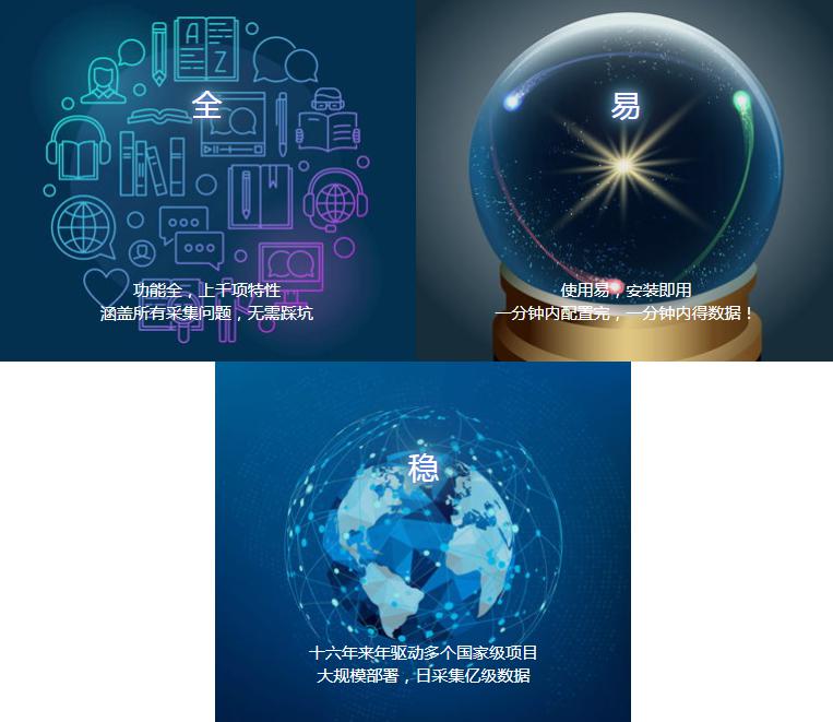 截止目前,Web存在至少10亿个网页,而且网络内容每秒钟都在巨量增加,存在许多政企需要的大量有价值信息。例如,潜在客户的列表与联系信息,竞争产品的价格列表,实时金融新闻,舆情信息,口碑信息,供求信息,科研期刊,论坛帖子,博客文章等等。理所当然,Web是世界上最大的公共资源宝库。然而,由于关键信息都是以半结构化形式存在于各个网站大量的HTML网页中,这使得许多信息难以集中起来并供政企直接加以利用,这是目前许多政企部门在信息采集时面临的难题。如何才能充分利用这世界上最大的公共资源宝库呢?