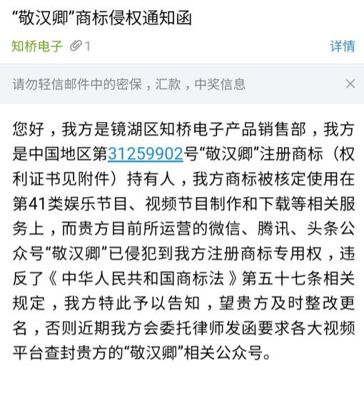 通知函称目前该公司持有“敬汉卿”注册商标41类使用权利,要求敬汉卿及时整改他所运营的各大社交自媒体账号名称,否则就律师函警告。