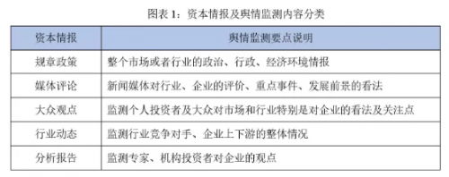 资本情报应全方位覆盖企业、行业、上下游和政治经济环境等方面的信息。把与企业相关的资本情报分类为:规章政策、媒体观点、群众观点、行业动态和分析报告等五类,各类资本情报监测要点情况如上图所示。