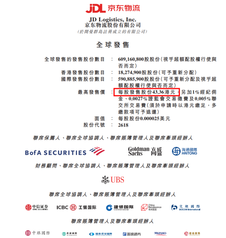 此外,京东物流发售价最高每股43.36港元,每手买卖单位100股,入场费约4379.69港元港元。