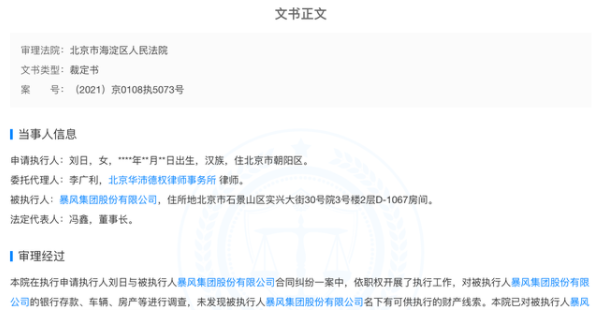 乐思网络舆情监测发现,暴风集团A股谢幕8个多月后,已无财产可供执行。7月6日,记者注意到,裁判文书网新增一份《刘日等合同执行裁定书》,申请执行人刘某,被执行人为暴风集团股份有限公司。案号(2021)京0108执5073号,审理法院为北京市海淀区人民法院。