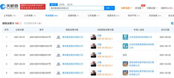 据天眼查数据显示,目前暴风集团共有185条限制消费令,涉及的法律诉讼高达1376起。