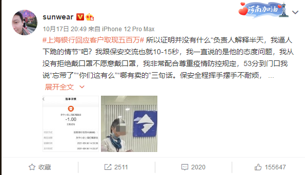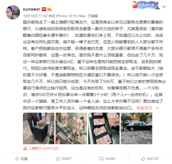 2021年10月16日,微博大V@sunwear 发文大致表示,国庆前我去了一趟上海银行虹梅支行,这是我有史以来见过服务态度意识最差的银行,从接电话的到保安到职员全都是一副你欠他的样子,尤其是保安。虽然我不是什么顶级富豪,但也放了几千万,我近一年这家银行流水接近4亿,基于这种态度我只能把钱全部取走,放到别的银行。由于数额较大,所以我不能一次全部取走几千万,所以我只能分批取,今天先取了500万。