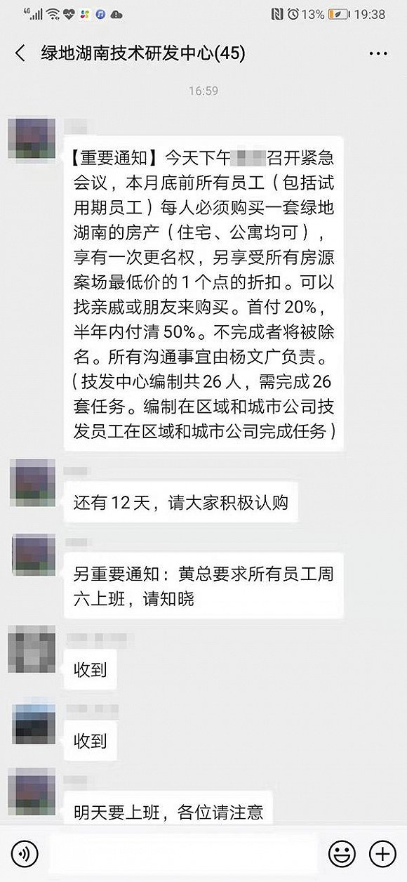 据媒体报道,近期绿地湖南事业部技术研发中心有员工反映,领导在微信群内发通知要求部门内所有员工或找其亲朋好友在月底前必须购买一套绿地湖南的房产,住宅、公寓均可,享有一次更名权和所有案场最低价1个点的折扣,首付20%,半年内付50%,“不完成者将被除名”。
