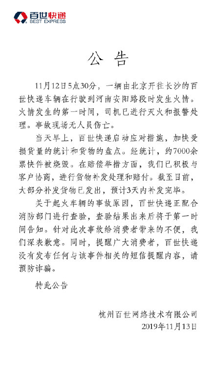 根据乐思网络舆情监测发现, 2019年11月12日5点30分,百世快递13吨包裹付之一炬,相关信息以个体在网络上首先发声,随后再有相关媒体的介入报道。11月13日15点52分,百世快递官方微博在经过34小时22分之后首发公告表态。