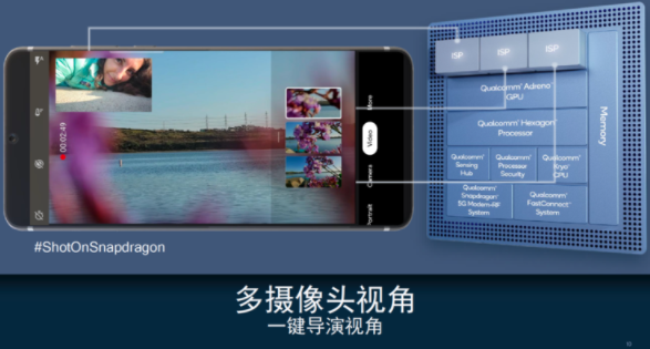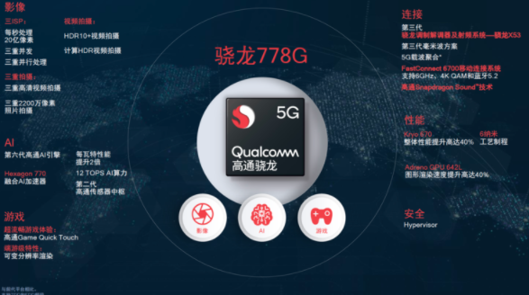 将硬件参数和性能转换为更容易感知的体验,骁龙778G强调的是影像、AI和游戏性能。影像方面,得益于ISP的三重并发性能,可以实现多摄像头视角。同时支持计算HDR视频拍摄。