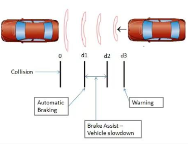 目前市场上已有的BAS与自动刹车系统,利用摄像头或雷达检测前方车辆,结合一定的行驶速度,分析出可能发生的碰撞时(如下图d3的距离),系统便警示驾驶员。