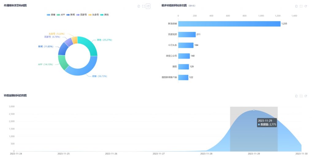 根据乐思网络舆情监测发现,滴滴崩了相关信息在29日到达传播高峰期,该日约有2775条相关信息,主要分布在微博和其他媒体平台,微博有1235条相关信息。