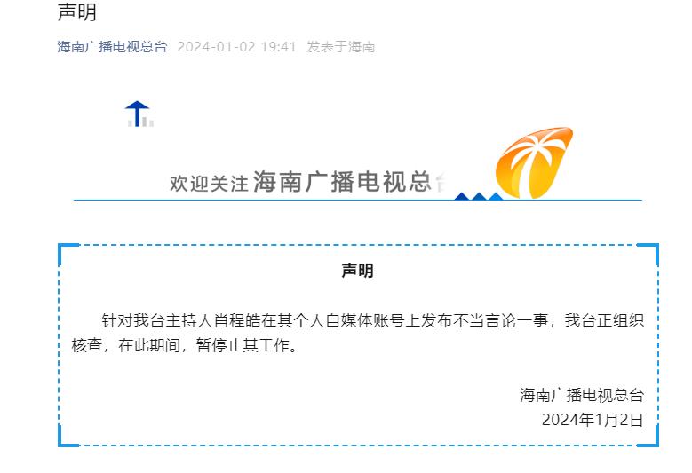 海南广播电视总台:主持人肖程皓发布不当言论,暂停止其工作——8家媒体报道