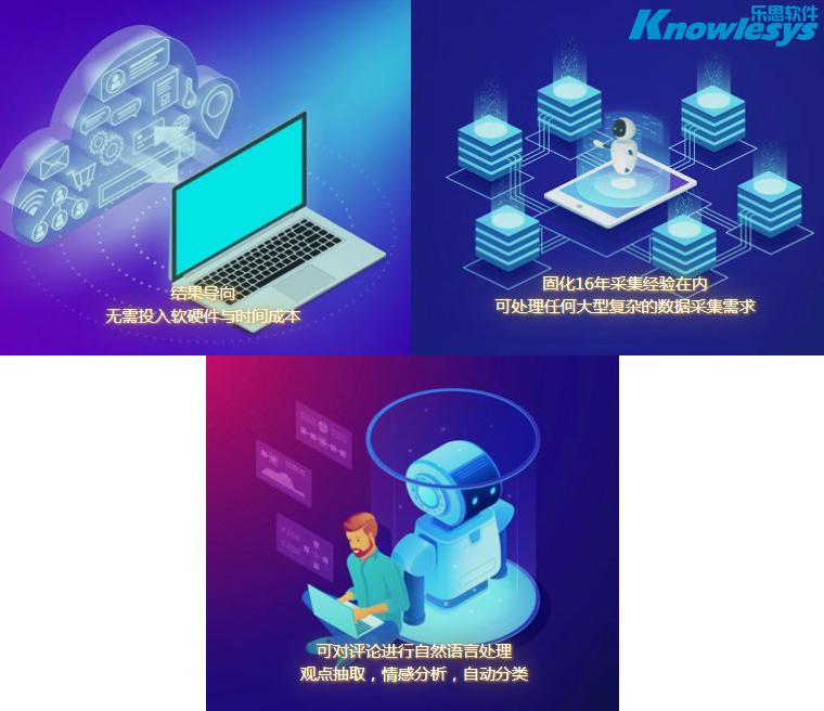 重要的是,乐思大数据交付服务无需技术人员,客户不需要额外花费软硬件等设备和维护与时间成本,就能够直接得到所需要的数据或报告。数据采集全部由技术提供方进行,根据客户要求,数据可经由自然语言处理进行观点抽取、情感分析、人工智能自动分类等,由客户指定数据提交格式:可为API/MDB/CSV/MySQL格式,也可为Word/Excel报告。乐思大数据交付服务为客户提供特定网站的实时数据抽取、定期交付数据或提供实时数据API等服务;也可针对指定网站上的文章、微博的所有转发评论数据、定制论坛版块的数据、指定电商网站目标和价格评价数据等等进行无遗漏搜集整理归档、并人工智能生出详尽的图文报告。