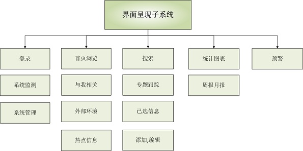 界面呈现子系统让各个数据来源的最新信息分门别类实时呈现在用户的桌面浏览器中。其功能架构如下。