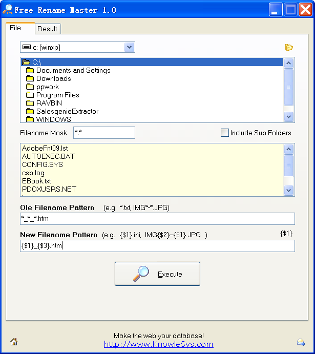 Batch Rename the files in seconds.A free software from KnowleSys.Free Rename Master 1.0 Free Rename Master is a powerful batch file rename tool. You can rename ABC_123_XYZ.htm to ABC_XYZ.htm by using the filename patterns: Old file name pattern: *_*_*.htm Enjoy it! System RequirementsMicrosoft Windows 95/98/Me/NT/2000/XP |