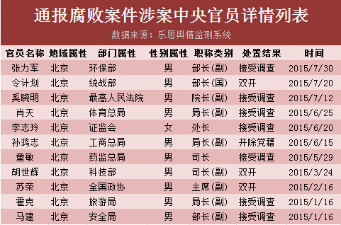 2015年上半年,查处中央部门机构涉腐官员11人,女性官员1人。其中令计划为统战部部长,属于副国级官员,为查处行政级别最高的“大老虎”。其他涉腐官员来自环保部、最高法院、体育总局、工商总局、药监总局、旅游局、安全局、科技部、全国政协和证监会等10个部门机构。所有涉案官员中副职8人,被双开3人,开除党籍1人,接受调查7人。
