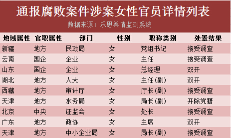 2015年上半年,中央查处通报腐败涉案女官员9人,分别来自新疆、云南、山东、湖北、西藏、天津、北京、广东等8省市区,涉及国企、民政局、审计厅、水务局、证监会、人大、政协和中小企业局等8个部门,其中有3人被双开,1人被开除党籍,5人正在接受调查。整体上,女生官员涉腐问题相对较少,涉案人员数量低。