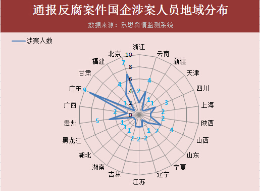 统计2015年上半年通报的国企反腐案件,59人涉案人员来自22个省份,涉及国企50家。其中广东、北京、贵州三省涉案人员最高,三省国企人员腐败问题最为严重。其次,福建、云南、山西国企涉腐人数均为4人,腐败问题较为严重。