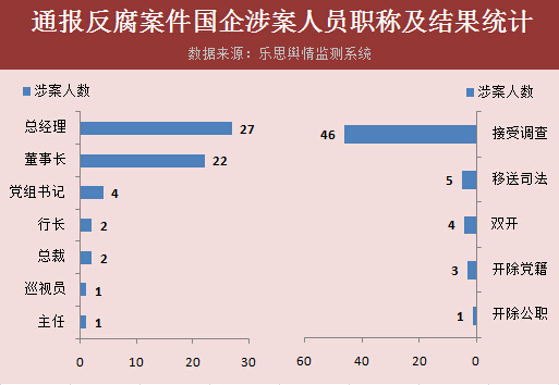 2015年上半年的国企反腐案通报中,涉案人员59人,其中任职总经理职位的27人,任职董事长职位的22人,党组书记4人,行长2人,总裁2人,巡视员1人,主任1人。所有涉案人员中,女性2人,其中1人被开除公职,3人被开除党籍,4人被双开,5人被移送司法,46人正在接受调查。4月份成为国企涉腐案件通报集中时段。