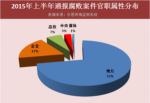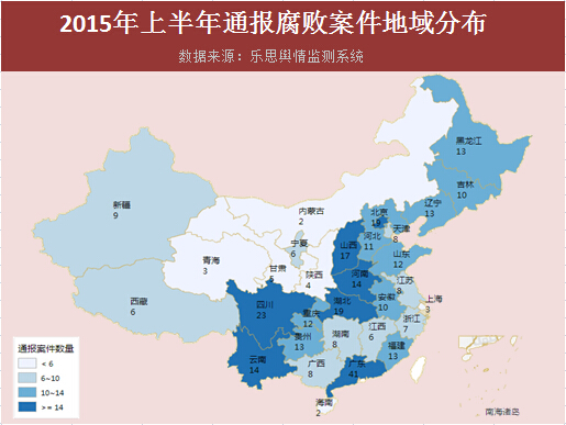 统计2015年上半年涉腐案件地域分布状况,广东、四川、湖北、山西、河南、云南6省成为中央重点“打虎拍蝇”的省份,其通报涉腐案件分别为41件、23件、19件、17件、14件、14件,总数达128件,占总涉腐案件的38%。相对来说,内蒙古、陕西、甘肃、青海四省的反腐形式较为缓和,未出现大面积官员被查问题。而作为腐败高发区的省区,需要加强反腐舆情监测,做好及时的舆论疏导,维护好政府和官员舆论公信力。