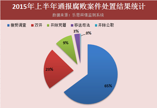 统计2015年上半年腐败案件处置结果,目前处于被调查期的官员219人,占比65%。76人被双开,32人被开除党籍,10人被移送司法,1人被开除公职。双开成为中央处理涉腐官员的主要方式。