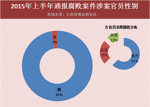 从2015年上半年通报腐败案件的涉腐官员性别来看,男性官员成为腐败案件主要群体,在339为涉腐官员中,男性官员330人,占比97%,女性官员9人,占比3%。其中,9名涉腐被通报的女性官员,5人来自地方政府部门,1人来自中央部门,还有2人就职于国企。从涉腐案件官员性别来看,男性官员往往比女性官员更容易掉入“腐败深渊”。