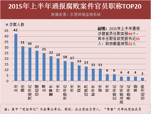 统计的2015年上半年通报的涉腐官员职称分布,涉腐官员任职类别34个,党委书记任职人数35人,省/市/县长任职人数22人。其中,主任、局长、党组书记成为官员落马的重点岗位,落马官员人数分别为42人、31人、30人。其次,厅长、市委书记、市长、部长、区委书记、县委书记岗位通报涉案官员人数也都在前20名。总体来看,所涉及通报的官员任职基本是各级政府部门党委“一把手”,这一现象受“中央纪律检查委员会第五次全体会议提出,加强对地市县的巡视,盯住“一把手”和班子成员“的决策影响。