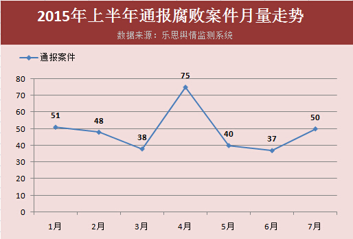 从2015年上半年中央反腐案件月量走势图看,整个腐败案件增长趋势呈“W”型,1月份新年伊始,以单月51件反腐案件通报的数量宣告2015年的高压反腐拉开序幕。之后随着春节来临,2月开始反腐通报案件量有所下降,到3月达到最低点38件。4月份,中央个巡视组巡视基本结束,加之春节也已结束,反腐工作进入关键点,通告反腐案件也到达上半年的顶峰,通报涉腐案件75个。4月份的巡视结束后,5、6月份进入一个短暂休整期,月通报案件数也维持在40件左右。7月份开始,反腐工作再次回归高压,通报案件开始回升至50件。整个上半年,案件通报数虽有起伏,但总体保持在月均37件以上,显示反腐力度依旧高压。