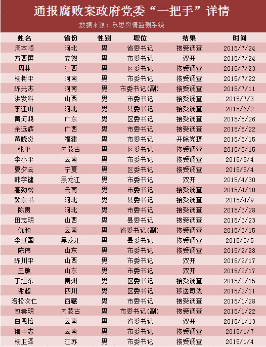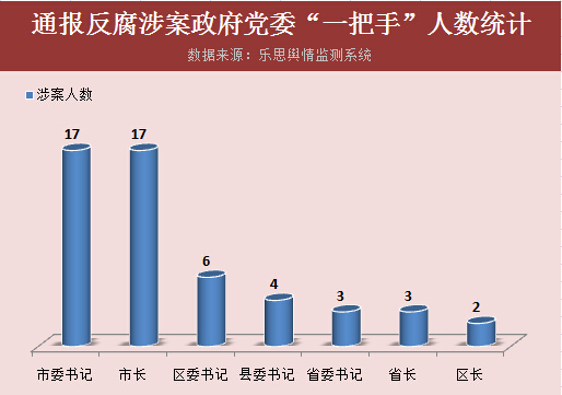 统计2015年上半年涉腐地方党政“一把手”官员,涉腐人数52人,其中市委书记岗位涉腐17人,市长岗位涉腐17人,区委书记岗位涉腐6人,县委书记岗位涉腐4人,省委书记岗位涉腐3人,省长岗位涉腐3人,区长岗位涉腐2人。在30名涉腐县市省委书记中,5人被双开,1人开除党籍,1人被移送司法,23人正在接受调查。综上,地市级政府“一把手”是腐败滋生的高发区。