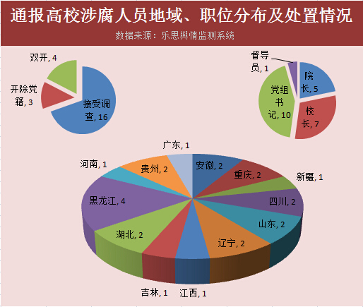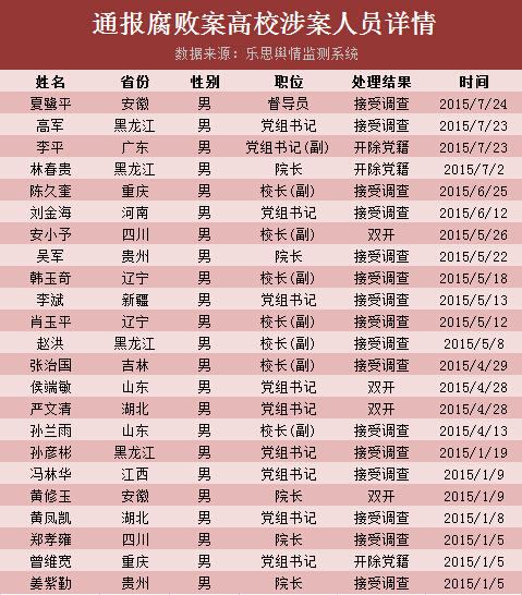 2015年上半年,中纪委通报涉腐案件总,涉及高校腐败案件23件,涉及人员23人,其中党组书记10人,校长职务7人,院长职务5人,督导员1人。在处置结果方面,被开除党籍3人,被双开4人,正在接受调查的16人。23人中,涉及省份13个,黑龙江省涉及人员最高4人,成为高校涉腐高发区。