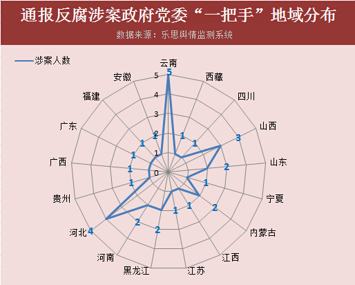 从各地政府党委涉腐“一把手”的分布来看,云南、河北和山西问题严重,任职县市省委书记的官员分别为5人、4人和3人。其次,山东、内蒙古、黑龙江、河南四省均为2人,广东、福建、安徽、广西、贵州、江苏、江西、宁夏、四川、西藏均为1人。总共涉及省份17个。