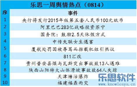 导读:8月14日,乐思一周舆情热点梳理统计:新版一百元人民币将发行;国务院鼓励2.5天休假方式;811汇改;贵州普安县煤与瓦斯突出事故;陕西山阳特大山体滑坡事故;天津塘沽爆炸……