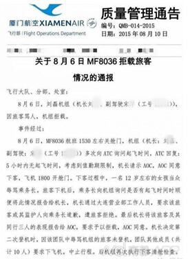 此前,厦航在《MF8036拒载旅客情况通报》中叙述了事发经过。通报称,8月6日15时30分许,MF8036机长询问ATC(航空交通管制)得知5小时内无起飞时间,ATC同意下客。下客时,一名12岁左右的女孩当众辱骂乘务长,反馈后机长要求该旅客或监护人向乘务长道歉遭拒。机长请示ATC后对方同意拒载。