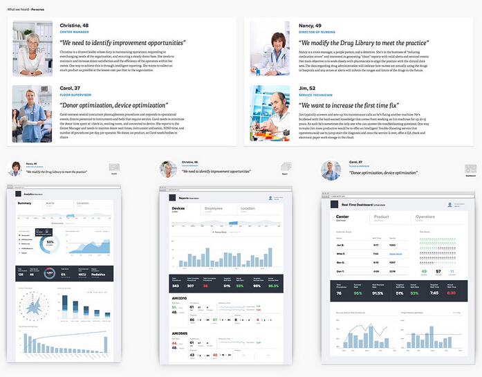 下面是我们去年做的一款健康报告应用的最终成品。这套系统有着不同的用户群,他们各自都需要不同的数据管理。创建了关键角色后,我们每次评审会将它们放在旁边。