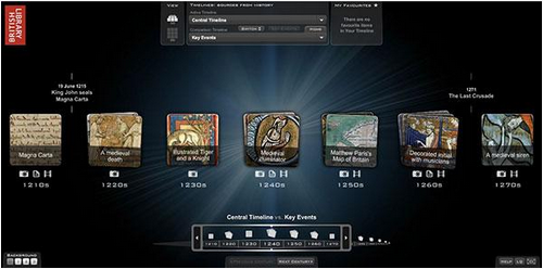 这个精致的时间线显示了大英图书馆中的西方历史资源。用户在显示的顶部选择一个时间线,然后通过在底部的滚轴控制时间周期,最后选择一个图像卡,并访问该卡背面的信息页面。与大多数时间线不同的是,使用交互的时间线并没有描绘一个完整而庞大的时间路径,而是将他们打包好,卡片化地放置在最底层的时间线上布局。这样的形式可以用在目前的游戏、网页页面中。