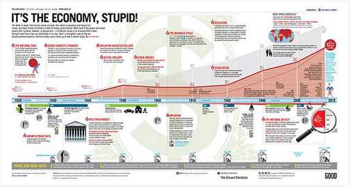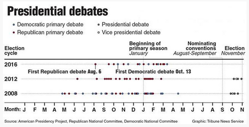 甘特图又称为横道图、条状图,即以图示的方式通过活动列表和时间刻度形象地表示出任何特定项目的活动顺序与持续时间。基本是一条线条图,横轴表示时间,纵轴表示项目,线条表示在整个期间上计划和实际的活动完成情况。甘特图不仅常常出现在我们的Excel项目计划里,也在影音剪辑软件等界面上颇为常见。这张时间线图描绘了“美国总统选举的辩论情况”。设计师为此创作多重的时间表:左侧代表了选举年份,上方代表了辩论日程,下方代表了每个阶段的议题,并有一个简单引向图例的颜色代码。我们可以将甘特图运用于项目的规划上,同时也可以用来反映一个项目进行中的多层面事件。