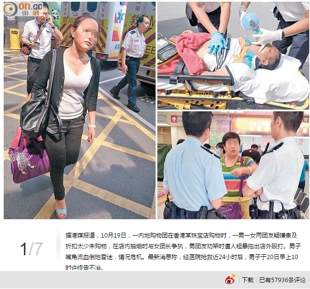 10月19日,一内地购物团在香港某珠宝店购物时,一男一女两团友疑嫌贵及折扣太少未购物,在店内抽烟时与女团长争执,男团友劝架时遭人粗暴拖出店外殴打。男子嘴角流血倒地昏迷,情况危机。最新消息称,经医院抢救近24小时后,男子于20日早上10时许终告不治。