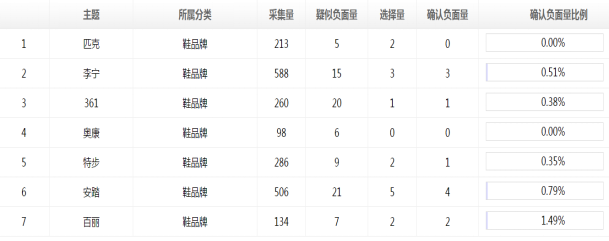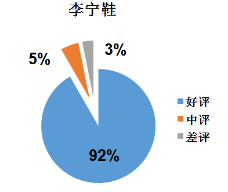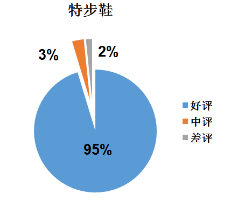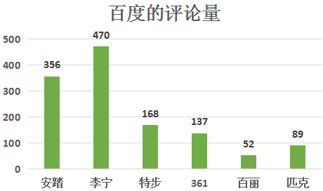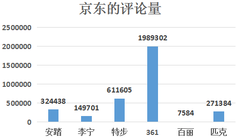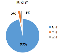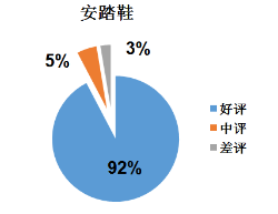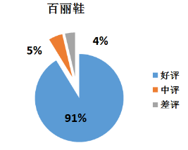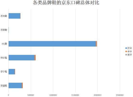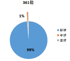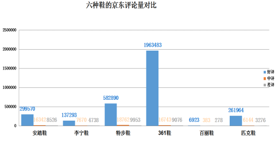 通过对比安踏、李宁、特步、361、百丽、匹克这6种鞋子的三种评价,得出结论:361这款鞋子的好评量是最多的,中评量和差评量也是最少的;最少的好评量是百丽这款鞋子,它的差评量也是最高的,高达4%,有可能是因为百丽的评论样本量不是足够大,导致数据有差异性。