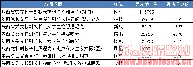 陕西省委党校副校长艳照在网上被曝光后,迅速在网上流传,并掀起一波舆情热议高潮,事件舆情热点骤增。据乐思舆情监测系统15日的监测数据显示,截至当天17时15分,关于“陕西省委党校副校长艳照”的话题新闻报道776篇,事件吸引了超过20万网友参与话题议论。其中网易新闻“陕西省委党校一副校长被曝“不雅照”(组图)”的报道就有超过10万人围观热议,腾讯“陕西省委党校副校长与女学生艳照曝光”的单篇报道网友跟帖4578条。从网友跟帖来看,舆论对于陕西省委党校副校长艳照表现出一致的反感、批评、谴责的态度,女研究生和该副校长都成为舆论口水的吐槽对象。