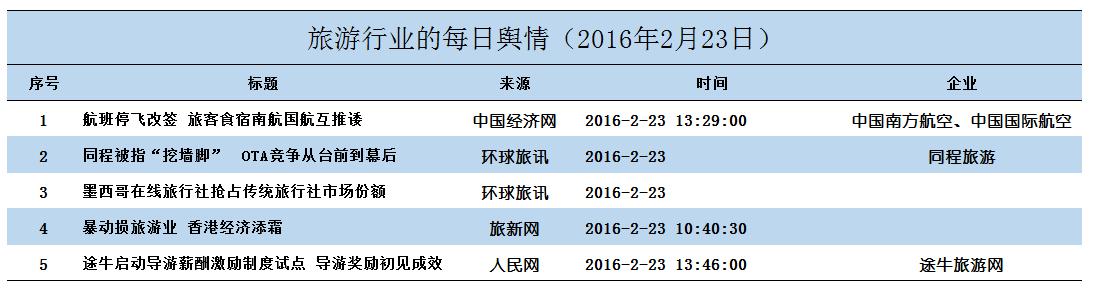 旅游舆情日报160223期:航班停飞改签 旅客食宿南航国航互推诿