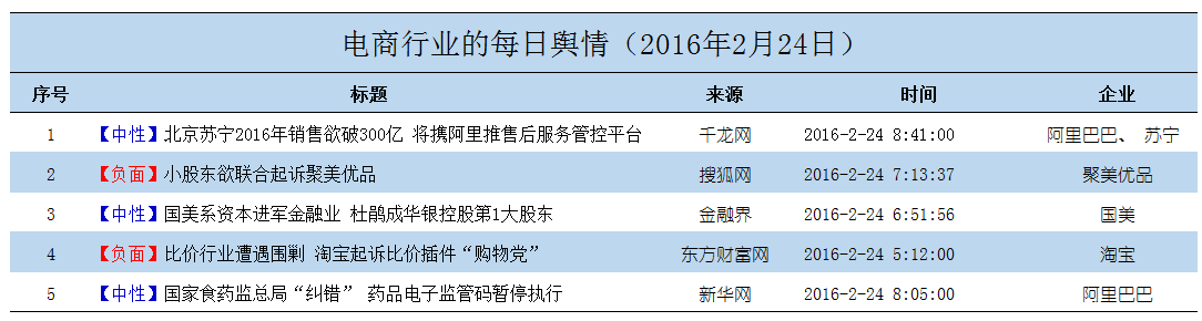 电商舆情日报160224期:北京苏宁2016年销售欲破300亿 将携阿里推售后服务管控平台