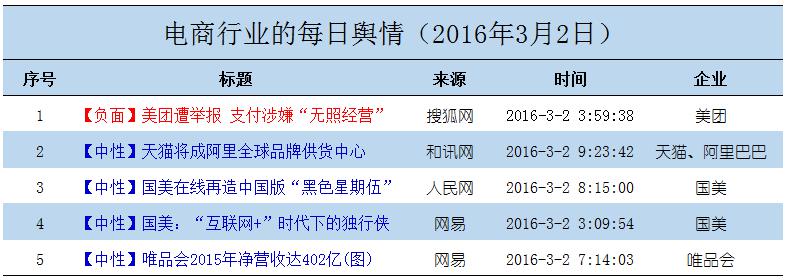 乐思舆情监测中心电商行业热点话题板块数据显示:2016年3月2日的热点舆情话题分别是以下5条: