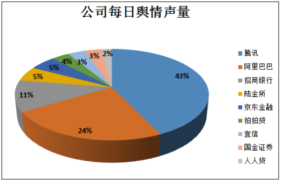 根据乐思网络舆情监测系统金融专题监测数据显示:2016年3月3日,金融行业相关舆情信息总量达16399条,其中疑似负面信息2894条,占总信息量的18%。其中今日话题排名前三的金融品牌分别是腾讯、阿里巴巴、招商银行,分别占总信息量的43%,24%,11%。